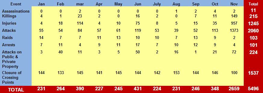 There is no doubt that Hamas has continually fired rockets over the border in Israel with little regard for targets, whether they are military installations, houses, or schools – with the IDF noting 764 rocket attacks this year up until November 14th. But Israel has also been regularly launching attacks on Gaza, 687 attacks between January and October this year according to statistics provided by the PLO (below).