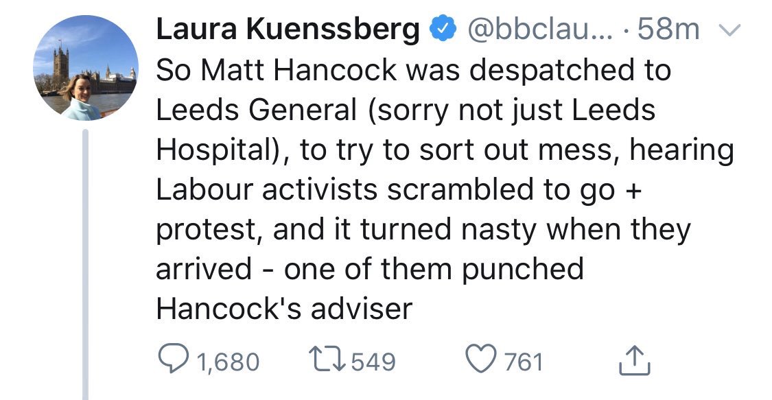 Have video from Hancock leaving Leeds General just come through so you can see for yourself – doesn’t look like punch thrown, rather, one of Tory team walks into protestor’s arm, pretty grim encounter pic.twitter.com/hD1KwA72gG