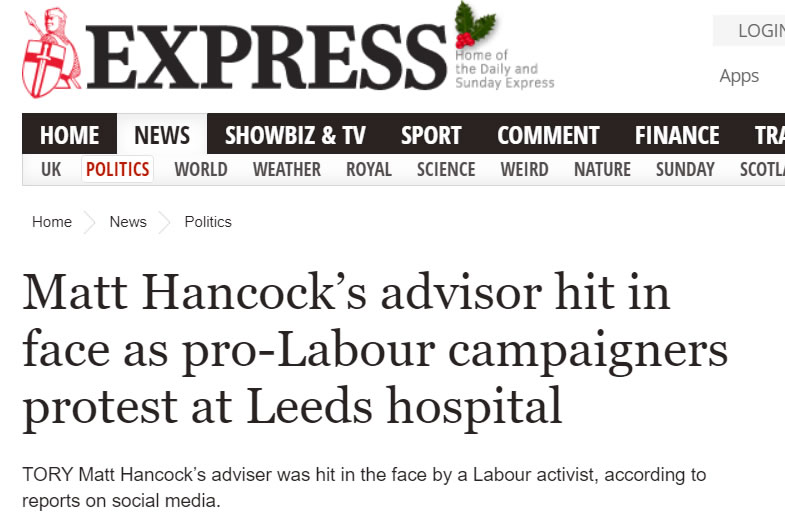 The Conservatives have been criticised for pushing out fake news to party supporters in the press, after a report of a Labour protester punching one of Matt Hancock’s advisers in the face has proved entirely false.
